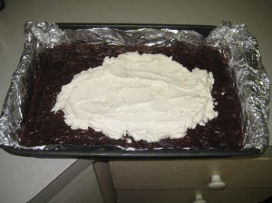 The ice cream part? That was easy too – I just spread a half gallon of softened vanilla ice cream over the brownies and stuck them in the freezer to harden up.