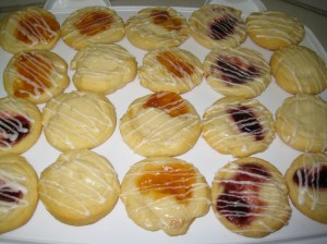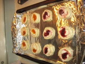 I spooned this, along with a bit a jam (I used raspberry and apricot), into the indentations, and baked them for about 20 minutes.