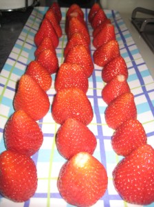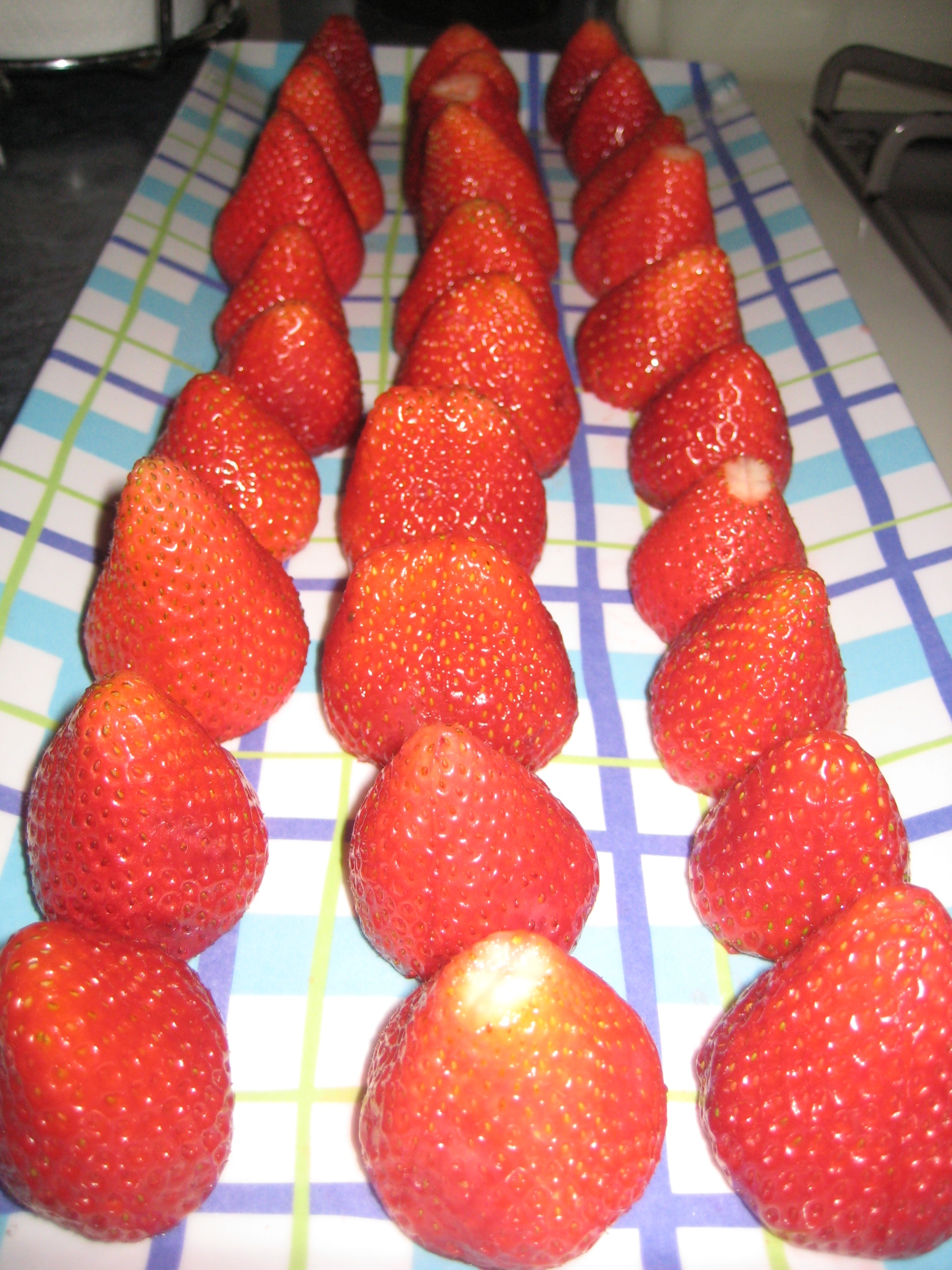 Cut a slice across the bottom of each strawberry so that they stand upright. Place berries, cut side down, on your plate. Carefully cut the berries into 4 wedges from the point, cutting close the bottoms. Next, spread the wedges with your fingers just a little so you can get the tip of your cheesecake filled bag inside!