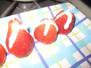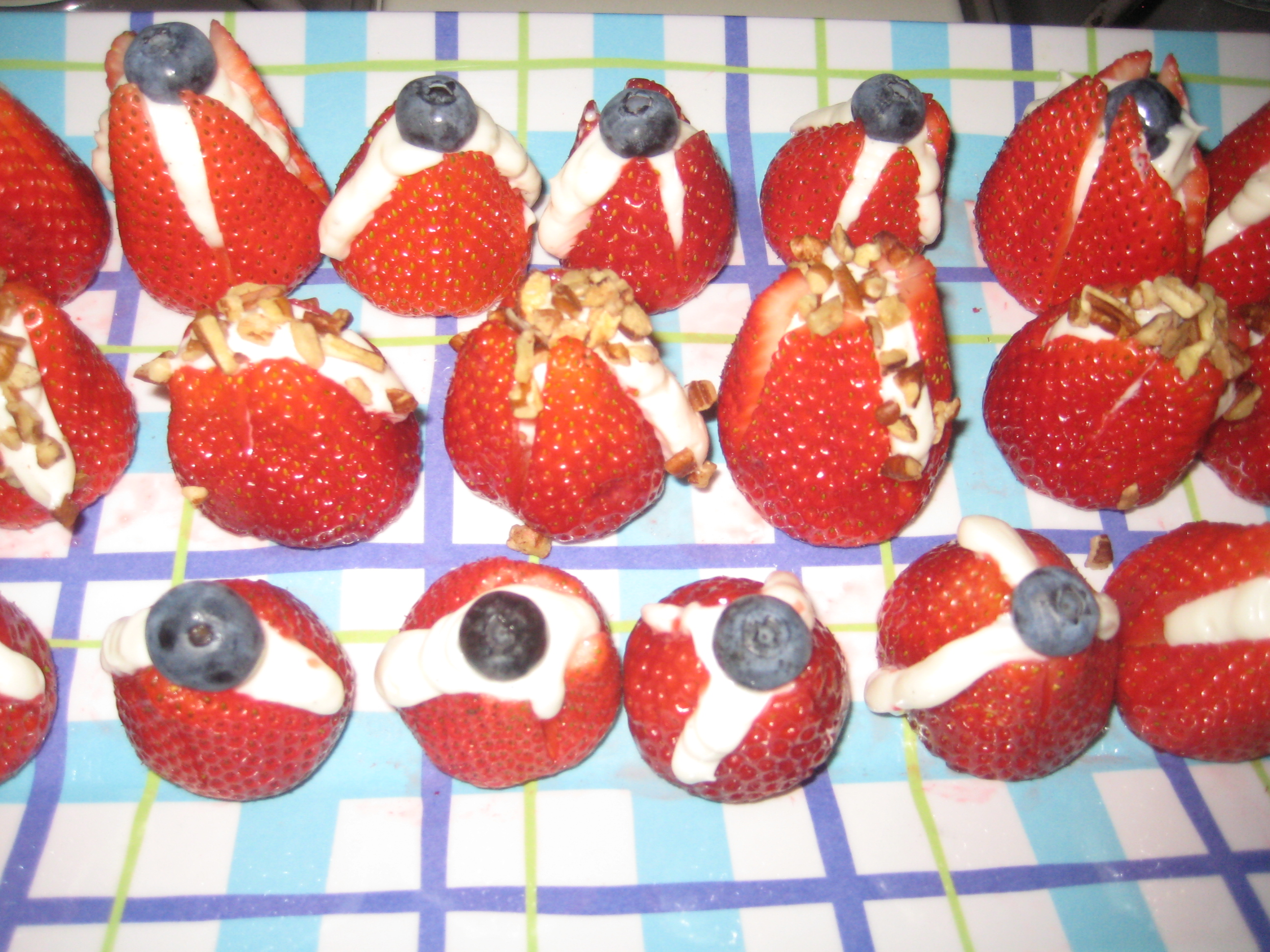 July 6, 2010 at 8:55 pm | Posted in Uncategorized | 3 CommentsGod Bless America. In honor of the Fourth of July (and in light of the fact that we were moving and unpacking boxes on the holiday weekend), I wanted to make something patriotic (and easy) to take to a BBQ before the fireworks. The standard. I decided on cheesecake stuffed strawberries, topped with blueberries, and they were delicious. And easy. And festive.