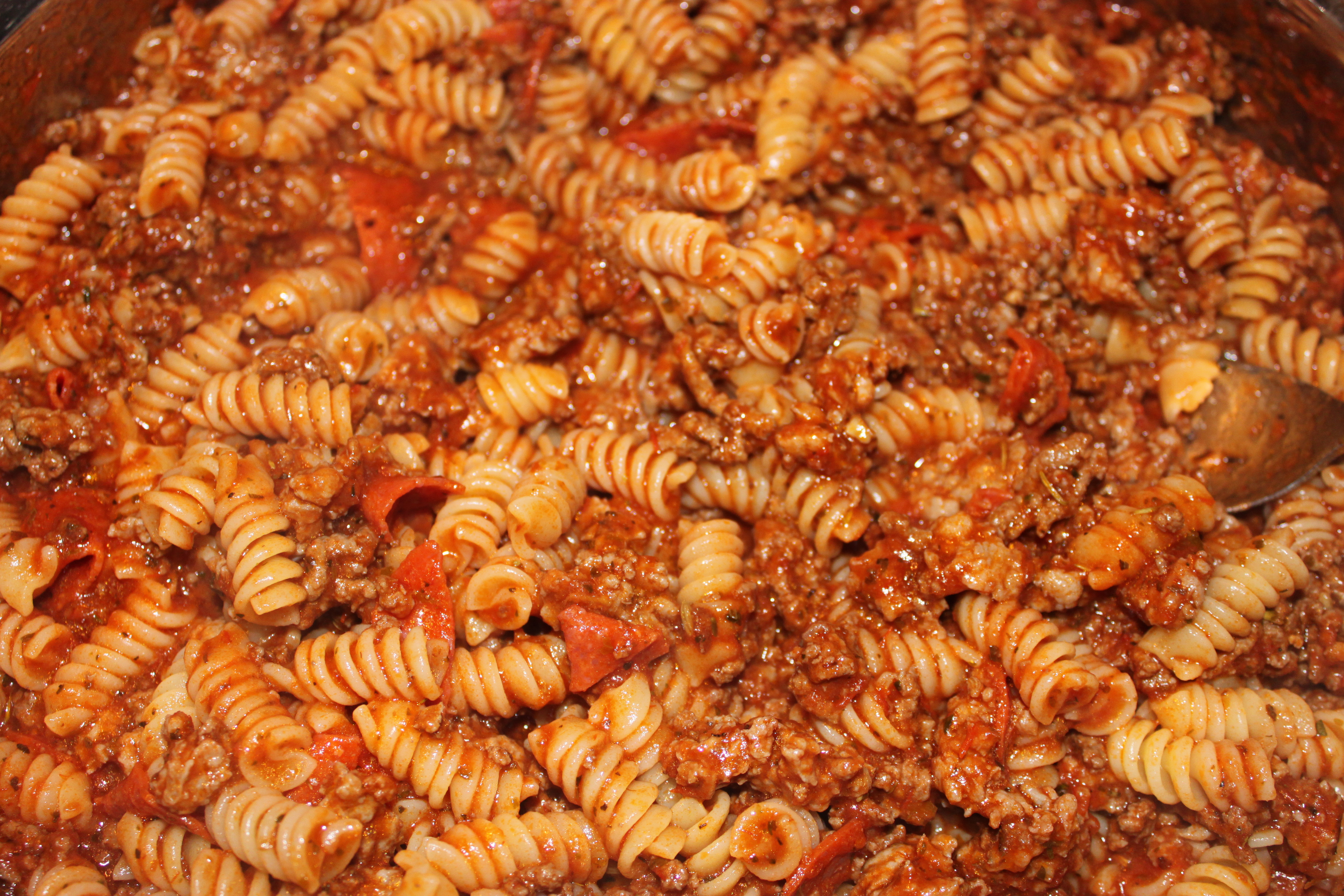 - In a medium skillet over medium-high heat, cook the ground beef and sausage. Stir in the pepperoni and pizza sauce, and mix well.