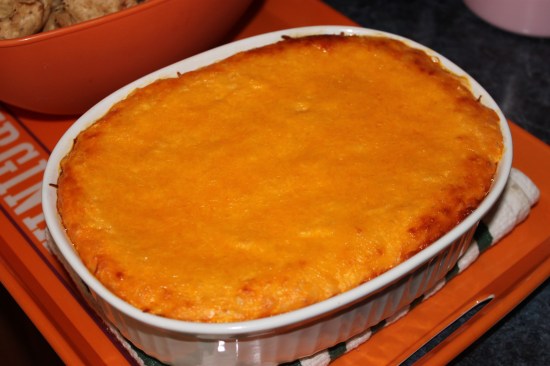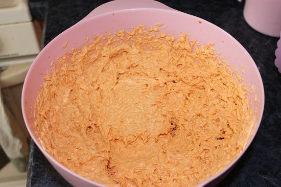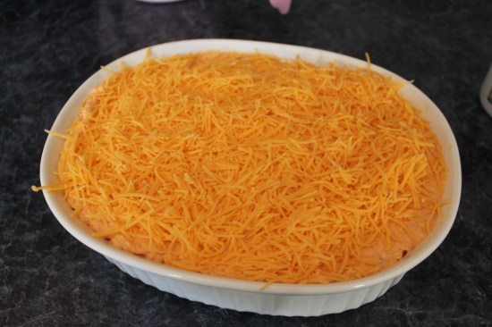 Using a hand mixer or brute force, mix all the ingredients together, with the exception of the last 1/2 cup of shredded cheese.