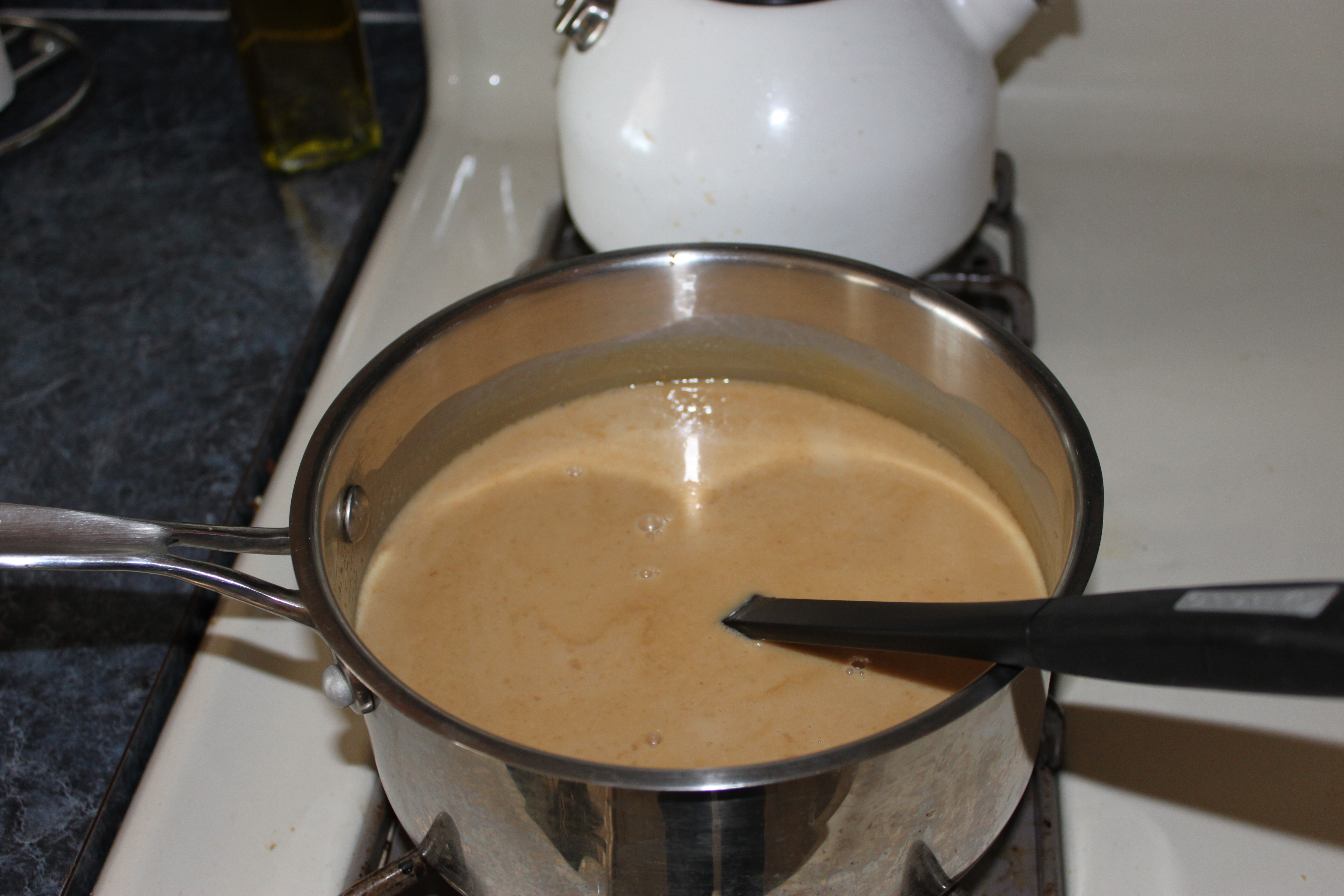 In a heavy 2-quart saucepan over medium heat, combine 1 1/2 cups of the cream and 1/2 cup of the brown sugar. Cook until bubbles form around the edges of the pan, about 5 minutes.