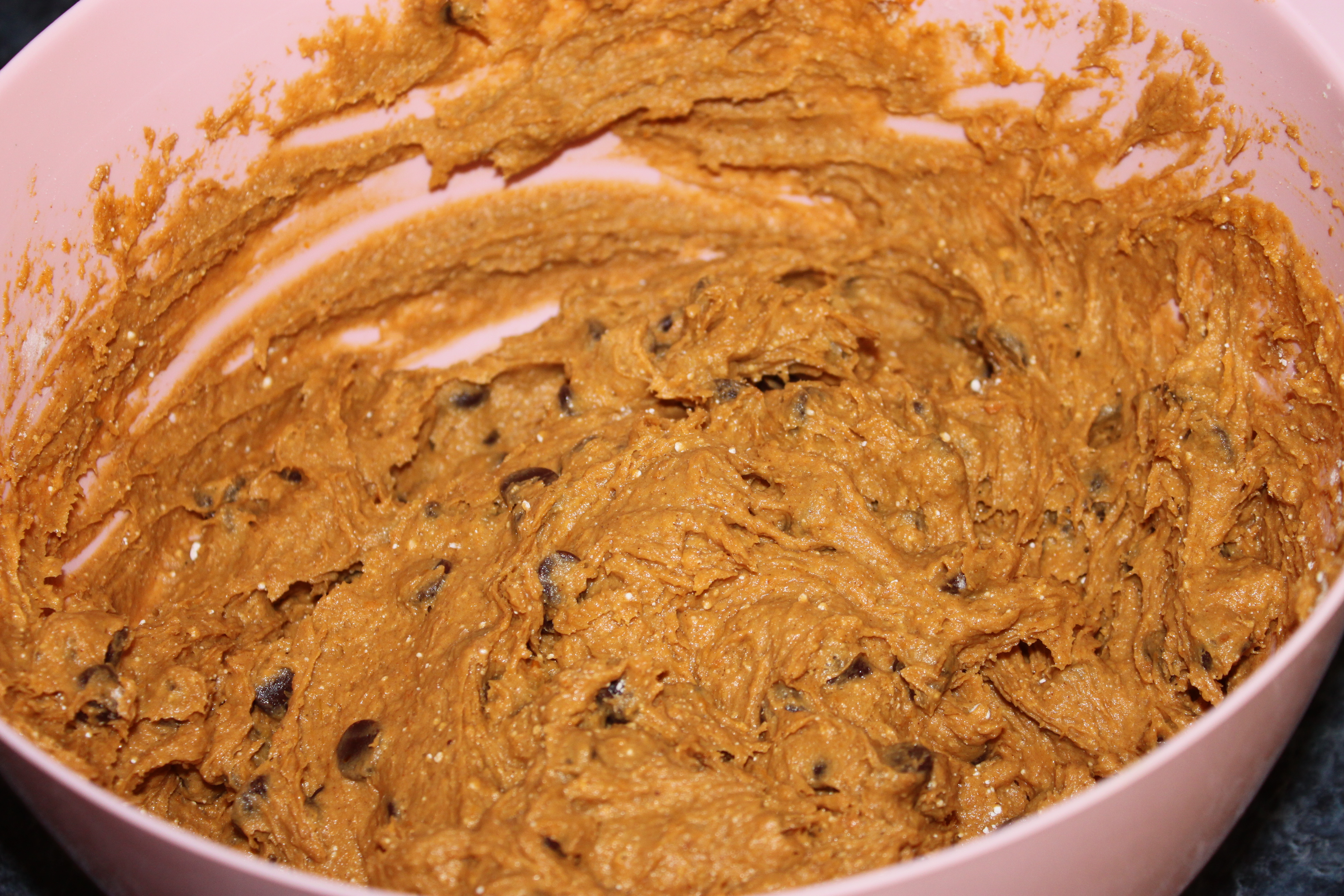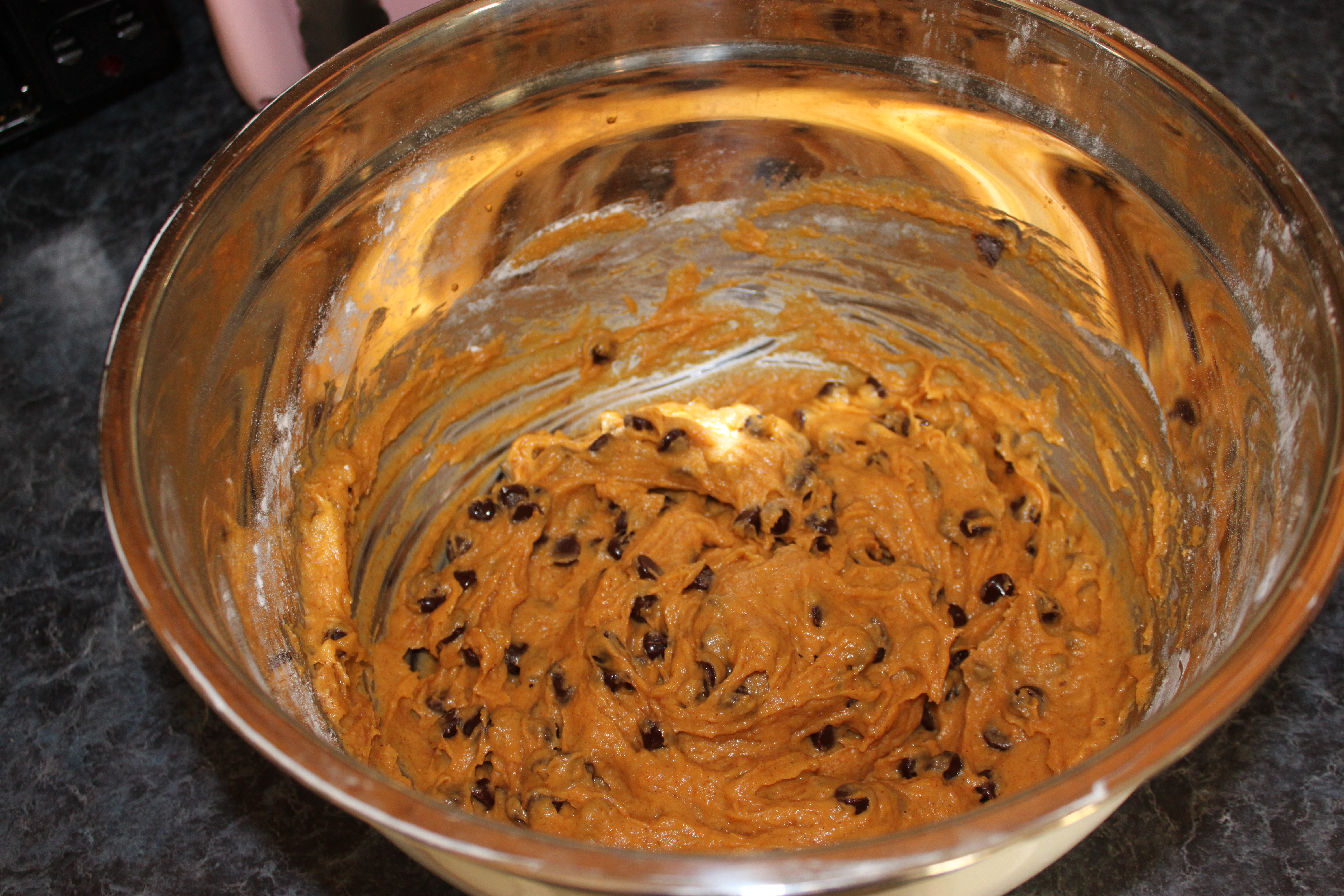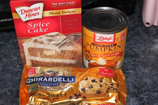 Mix together one spice cake mix, one 15-oz can of pumpkin (the smaller size), and two cups of chocolate chips.