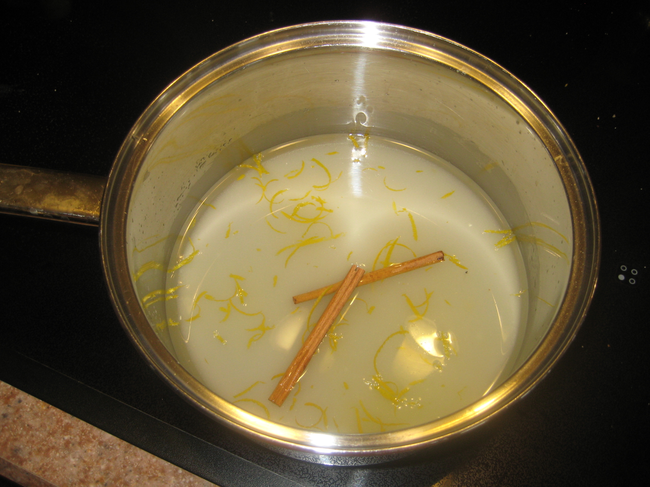 Combine first 4 ingredients in a medium saucepan and bring to a boil over medium heat (sugar, water, cinnamon, orange peel).