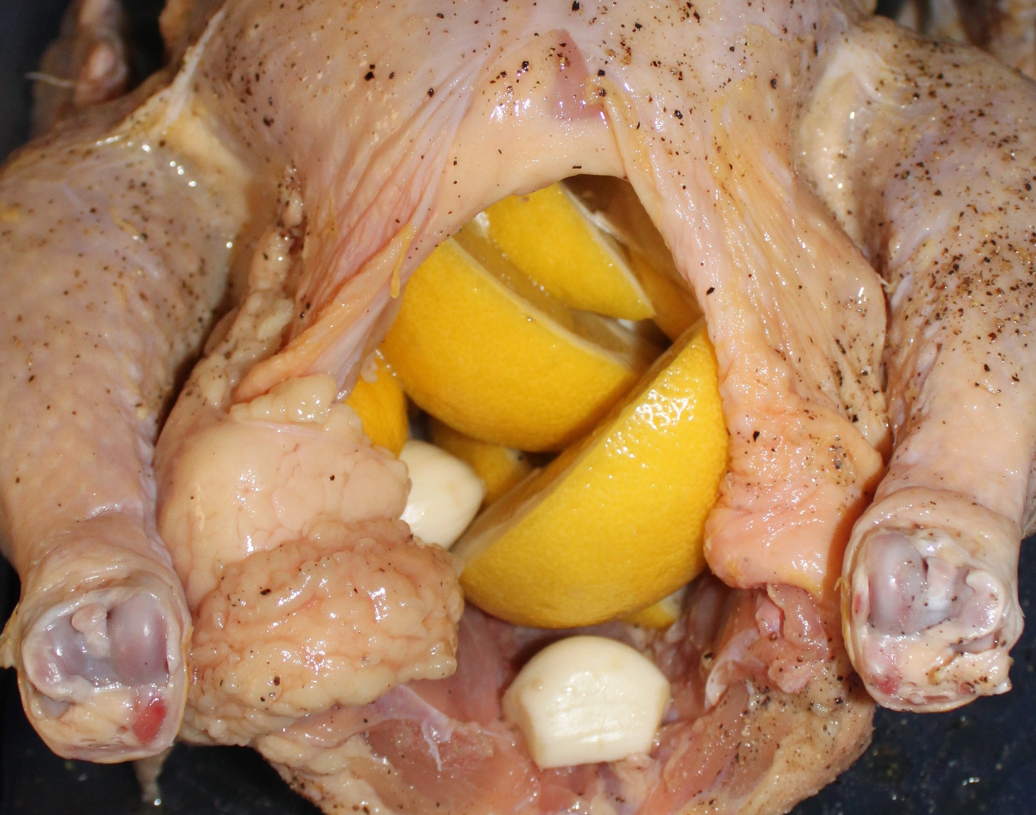 Remove and discard the chicken giblets. Pat the outside dry. Liberally salt and pepper the inside of the chicken. Cut the lemons in eighths, place one lemon in the chicken along with the garlic and reserve the rest of the lemon slices. Brush the outside of the chicken with olive oil and sprinkle the chicken liberally with salt and pepper.