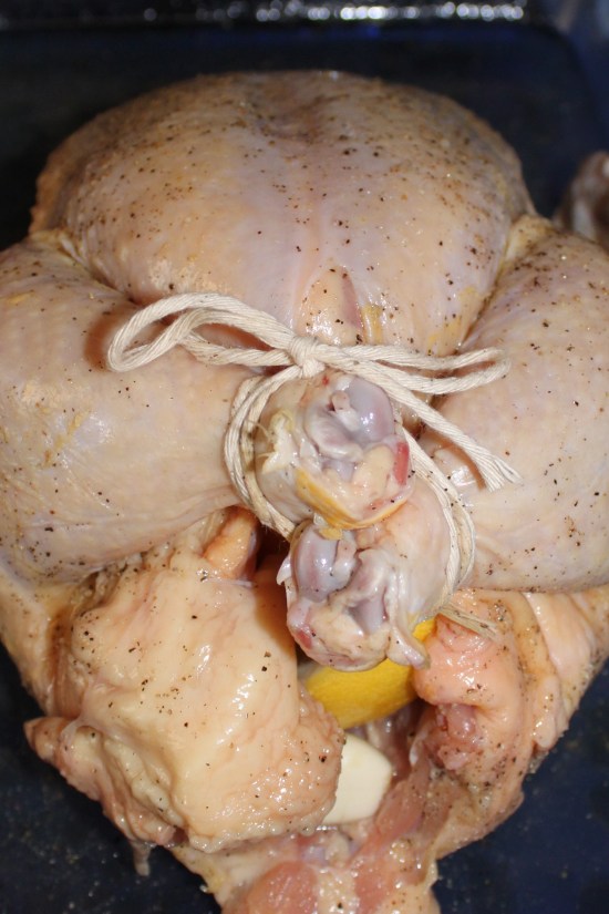 Tie the legs together with kitchen string and tuck the wing tips under the body of the chicken.