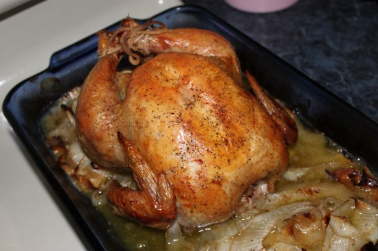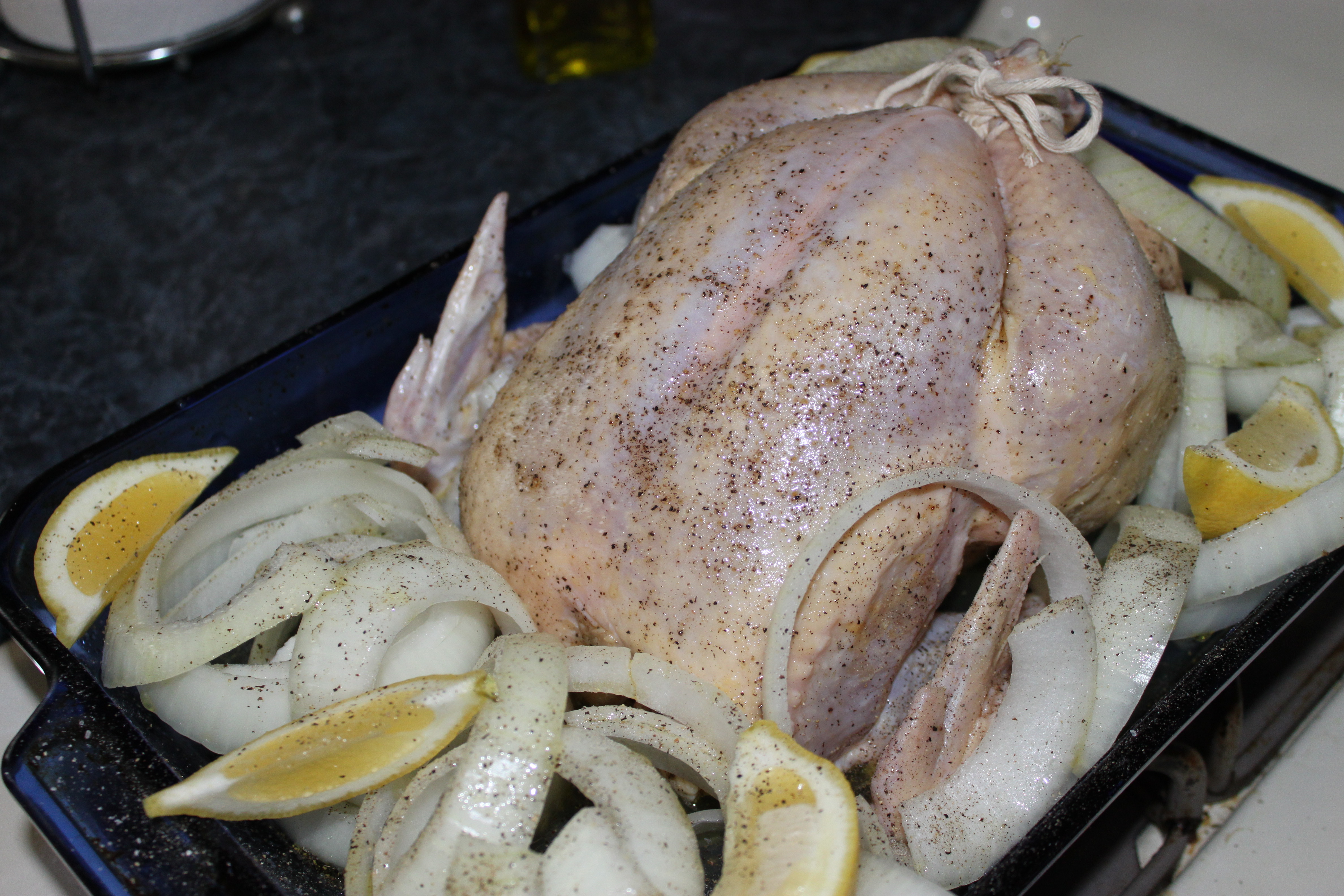 Place the chicken in a small roasting pan. (If the pan is too large, the onions will burn.) Place the reserved lemons and the sliced onions in a large bowl and toss with 2 tablespoons of olive oil, 1 teaspoon of salt, and 1/2 teaspoon of pepper. Pour the mixture around the chicken in the pan.