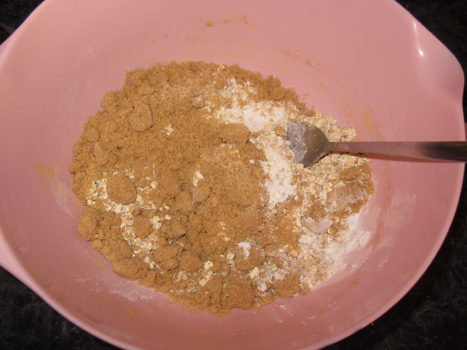 3. Stir together the flour, oats, brown sugar, baking soda and salt. Stir in the melted butter until well blended. Press half of the mixture into the bottom of a 9×13 inch baking pan. Reserve the rest.