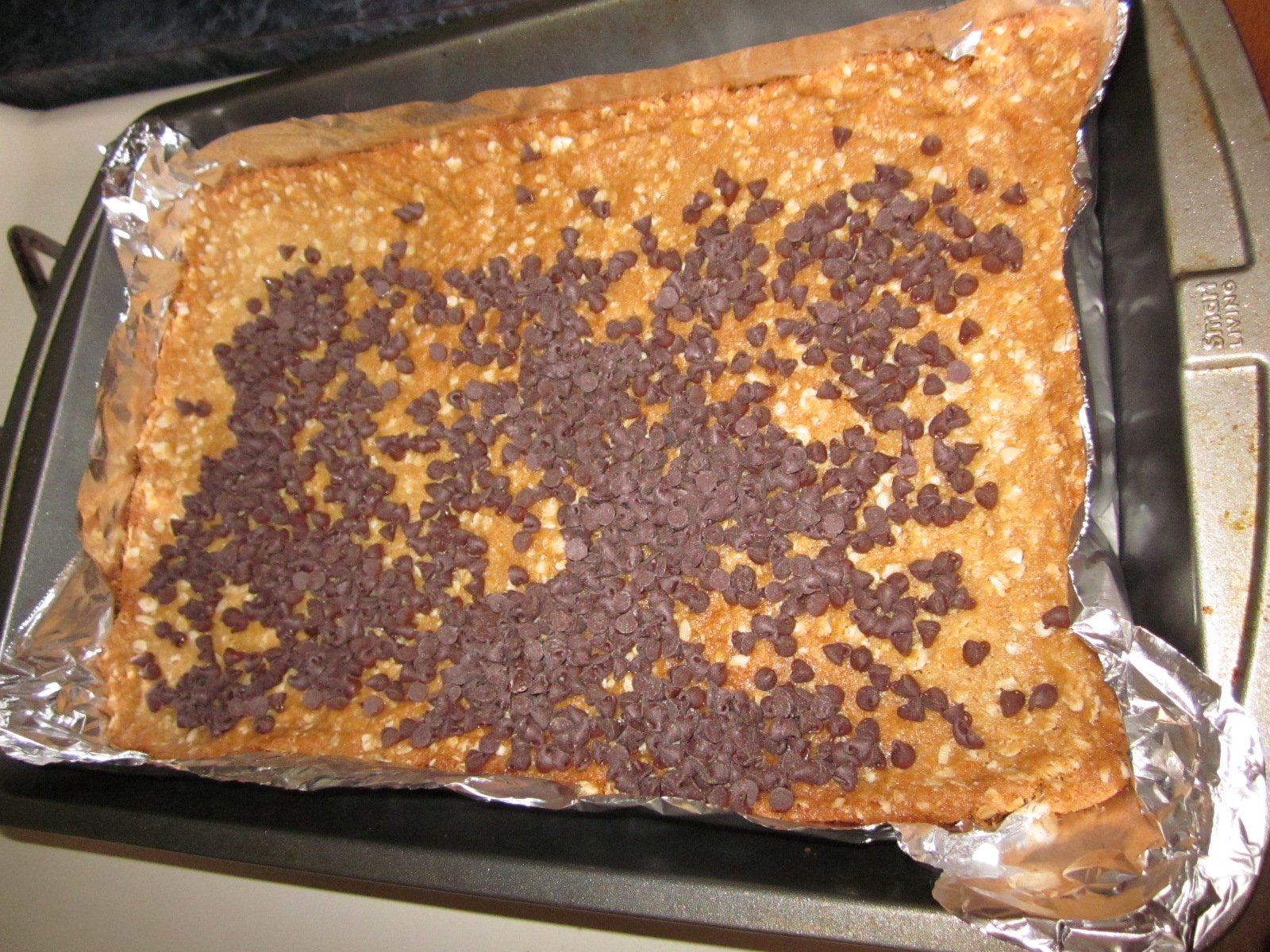 4. Bake the crust for 8 minutes in the preheated oven. Remove and sprinkle with chocolate chips.