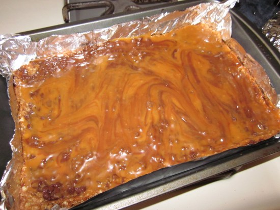 6. Crumble the remaining crust mixture over top of the caramel and chocolate.