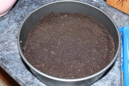 1. Mix melted butter with Oreo crumbs and press in the bottom of the spring pan and 1 1/2″ up the sides, set aside.