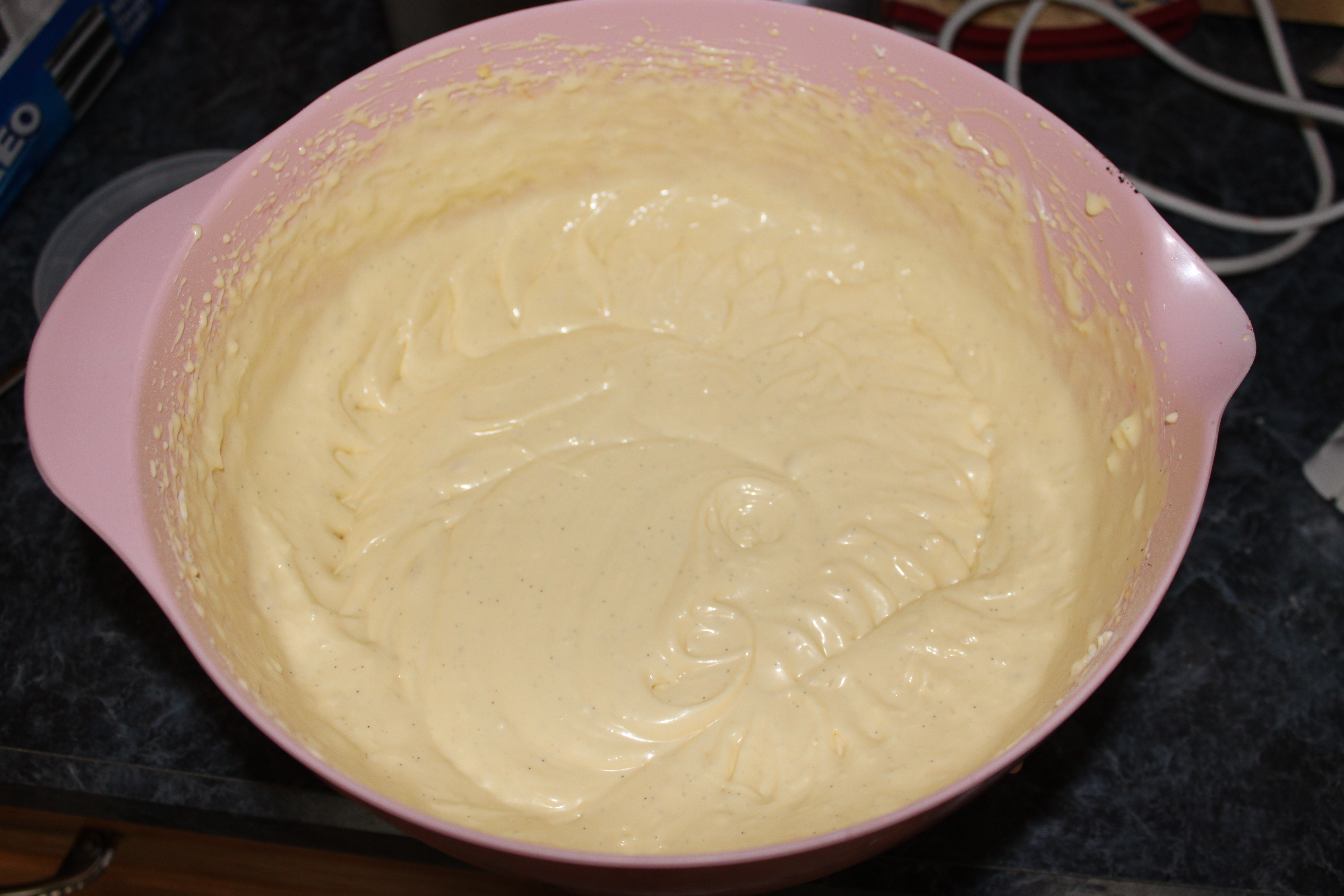 5. Measure the vanilla, salt and flour, pour into cream cheese and egg mixture and beat until smooth. Add the sour cream and beat.