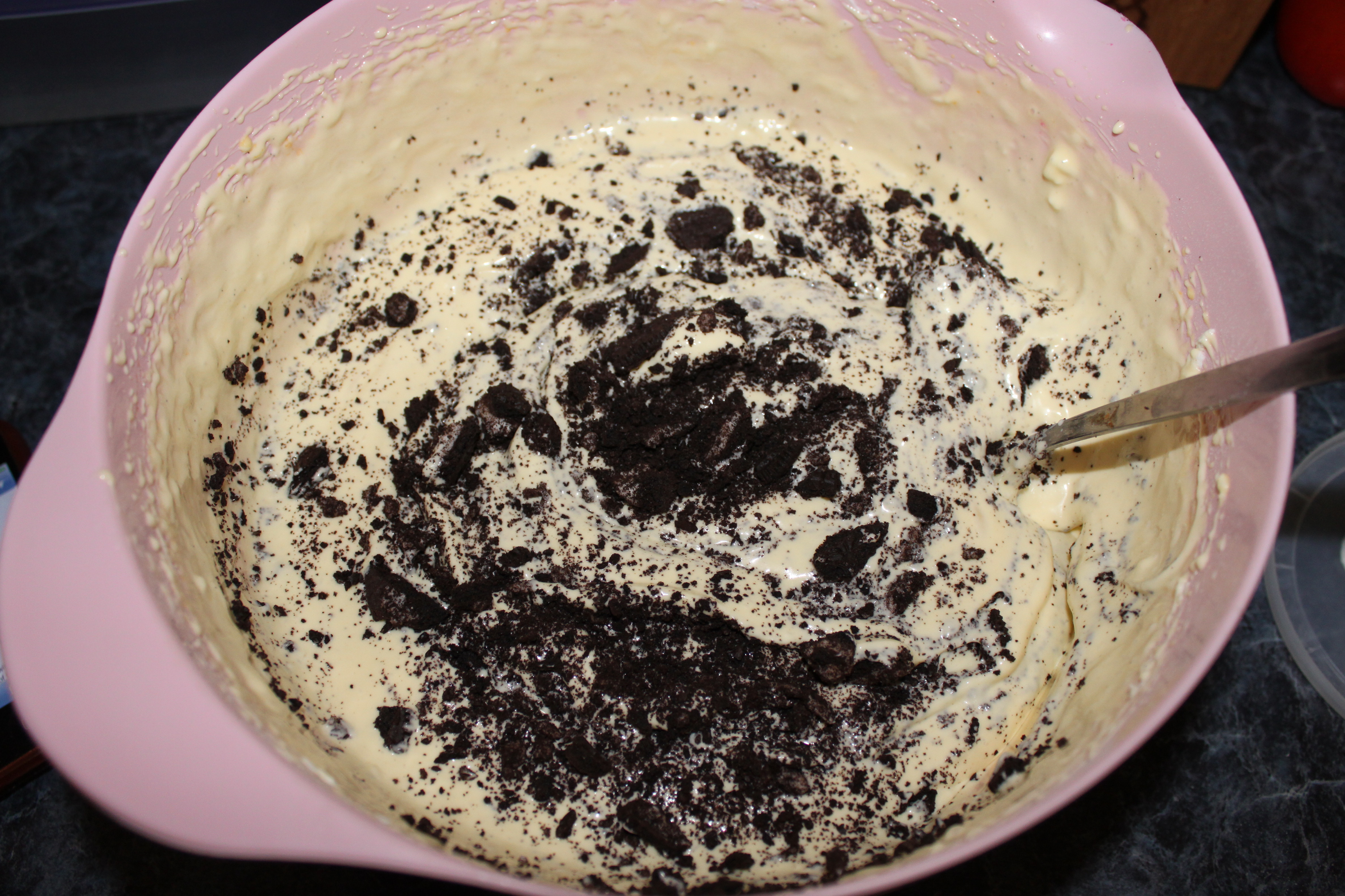 6. Stir in the coarsely chopped oreo cookies with a spoon.