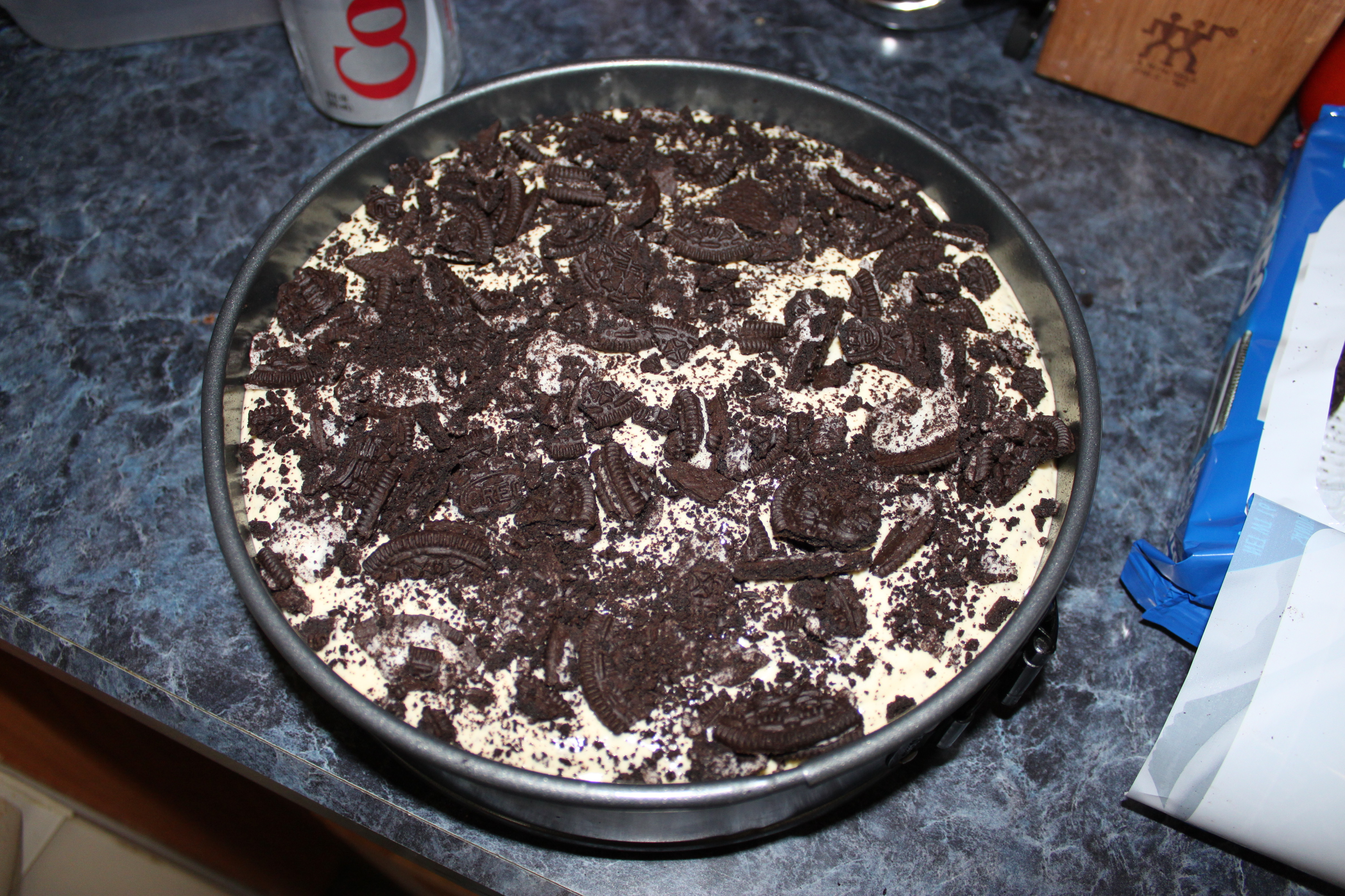 7. Pour cream cheese into the spring pan and place the nine coarsely chopped Oreo Cookies on to of the cream mixture.