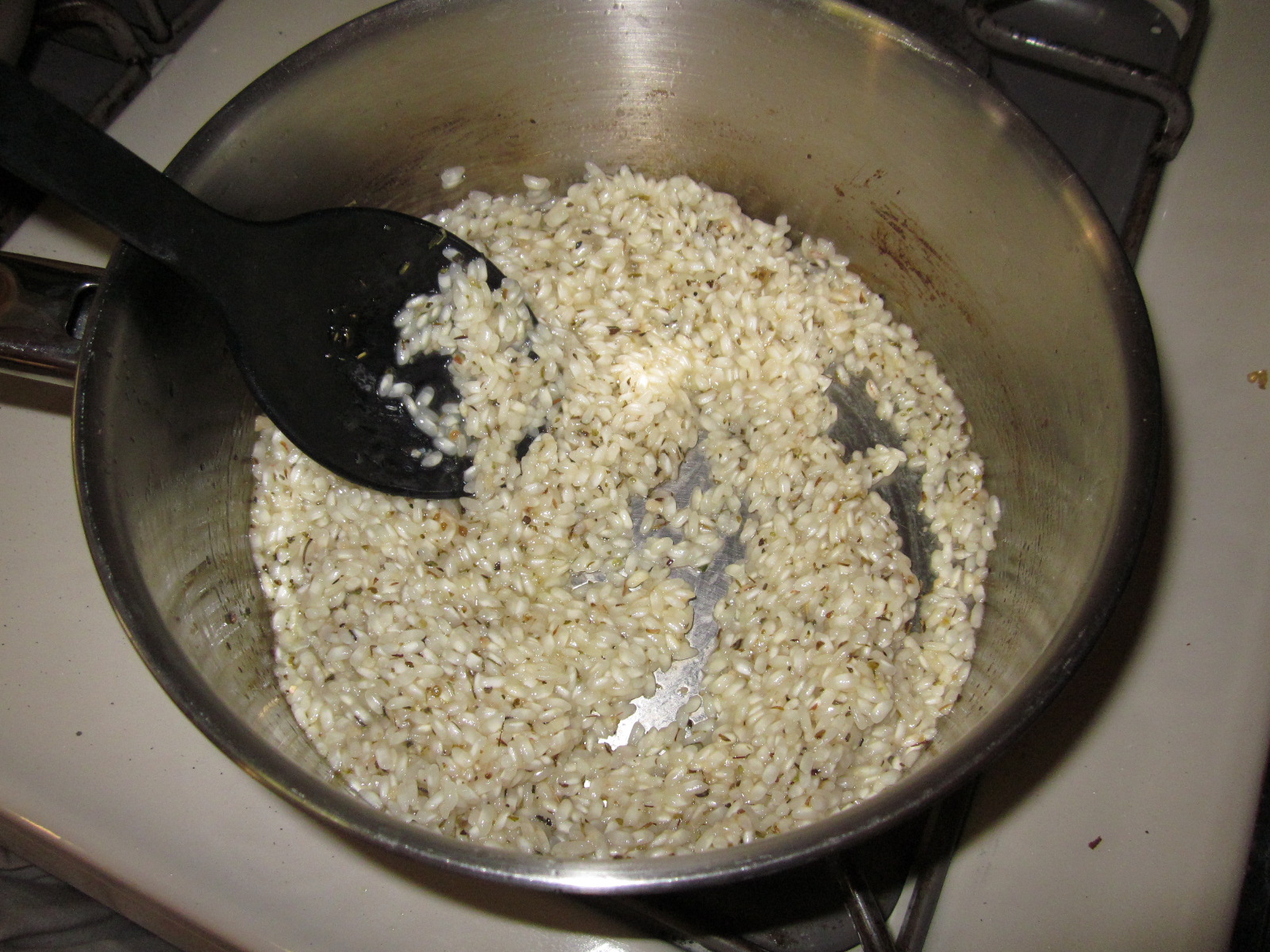 Slice up the sausage and heat it in a skillet – keep warm while you make the risotto.