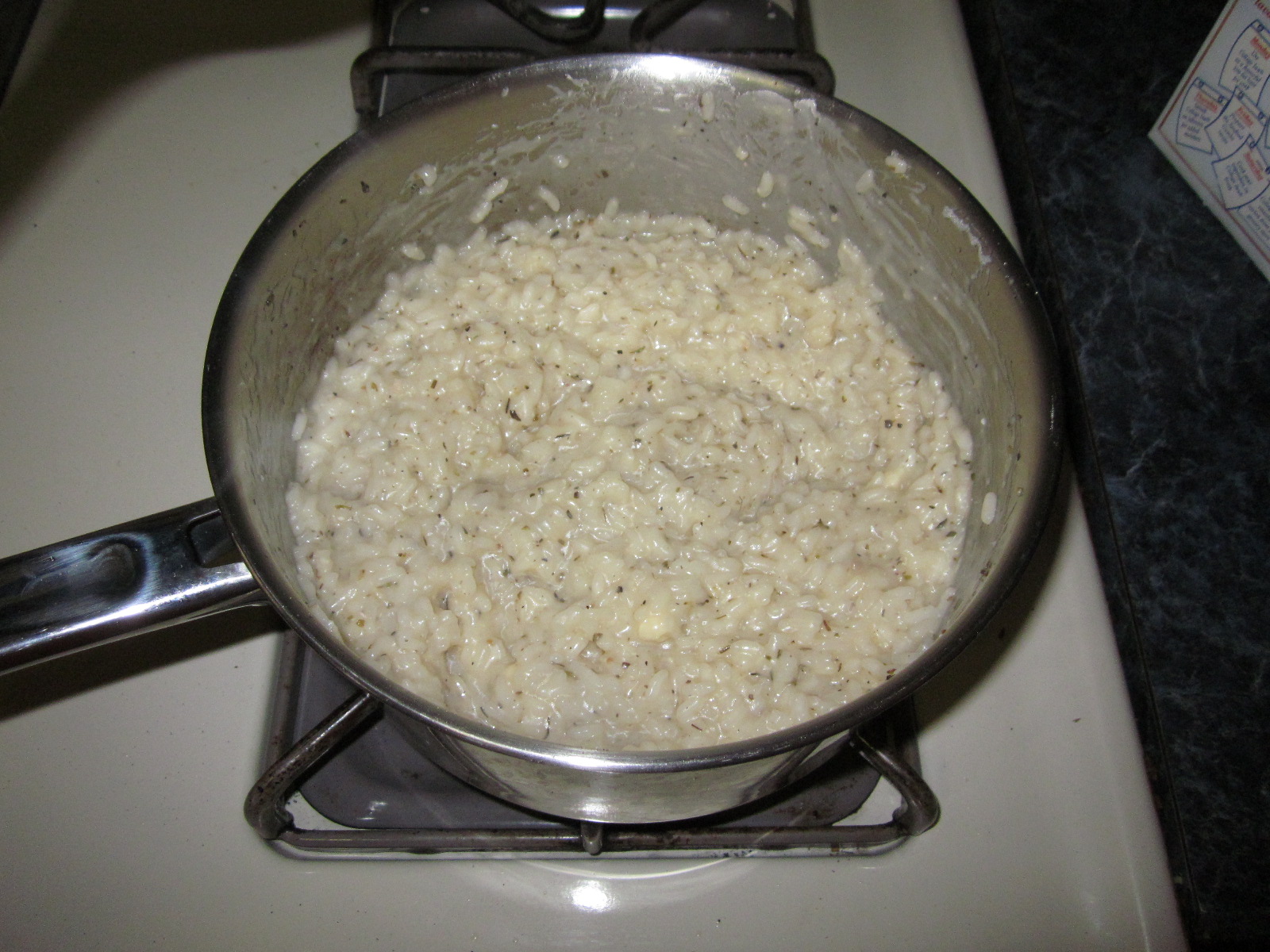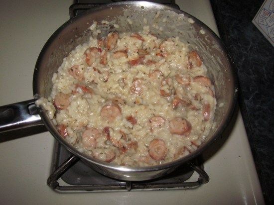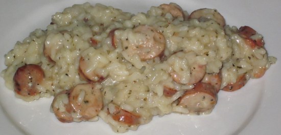 After we grilled a few links this weekend and declared it delicious, I started thinking of other ways to use up that sausage. So I came up with a basic creamy risotto and mixed in a little over a pound of the sausage (and I could have used quite a bit less – it was very meaty). Risotto is awesome because even with no butter, no milk, and no cream, this turns out super creamy and rich. This was a change of pace for us, and we enjoyed it – so I think I will freeze the rest of that chicken sausage for the next time we are craving this!!