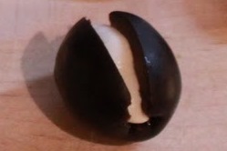 Slice open one side of a large olive. Using a plastic zip bag filled with cream cheese, stuff the large olive with cream cheese.