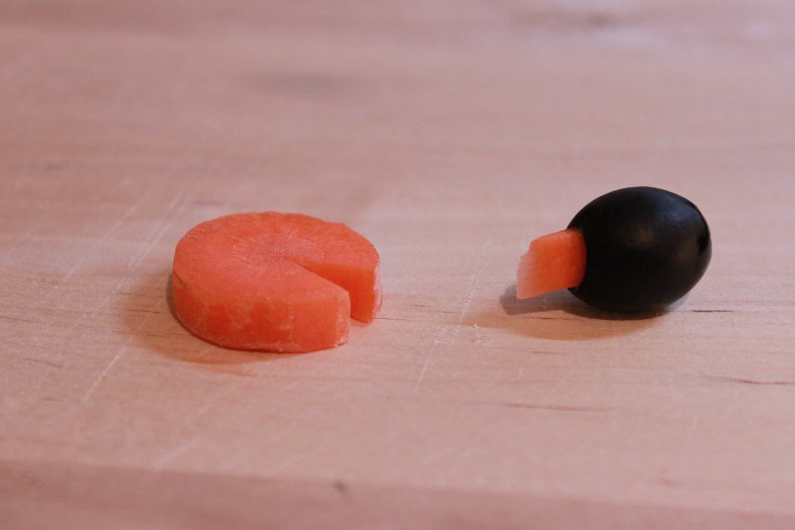 Slice your carrot into small rounds, and cut out a pie sized notch from your round, which you will stick into the opening of the small olive.
