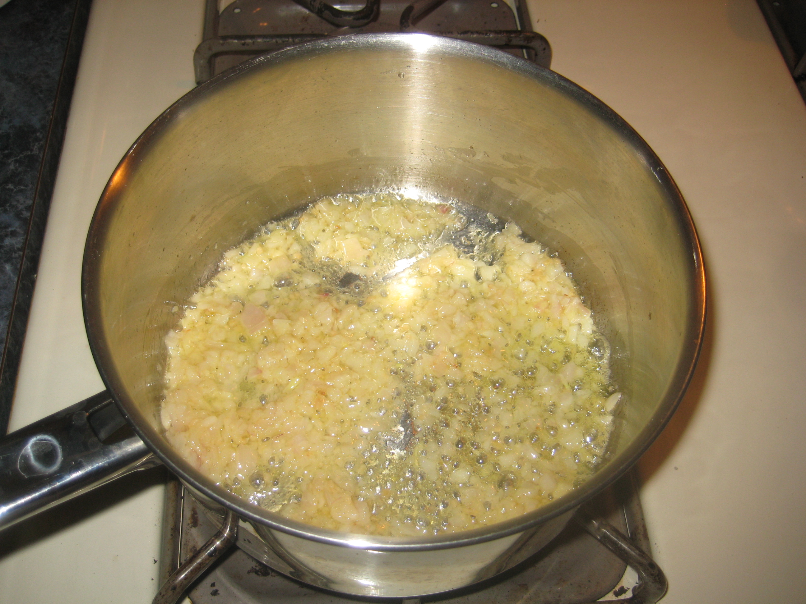 Heat a large skillet over moderate heat. Add oil, butter, garlic, and shallots. Gently saute shallots for 3 to 5 minutes to develop their sweetness.