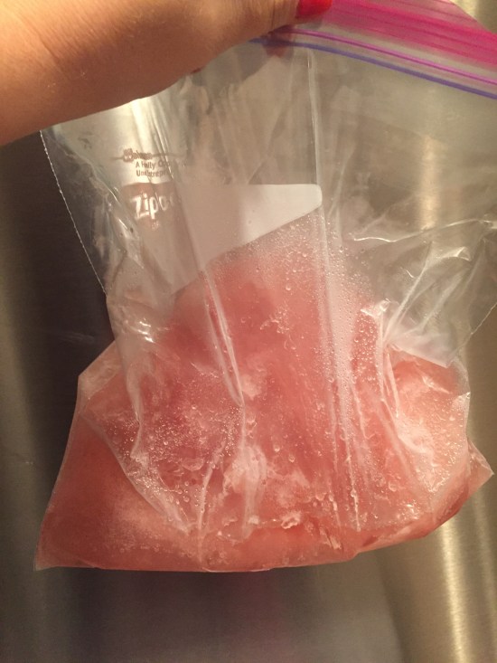 Freeze the wine in a large ziploc bag until it is mostly frozen – this is best to do overnight. It won’t freeze all the way but it will be pretty close, like this: