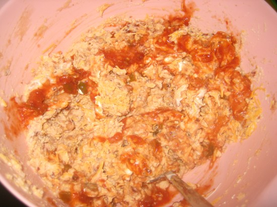 Using a hand mixer or brute force, mix all the ingredients together, with the exception of the last 1/2 cup of shredded cheese.